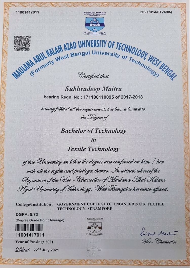 Established in 2001, the Maulana Abul Kalam Azad University of Technology, West Bengal is a non-profit public higher education institution located in the urban setting of the large metropolis of Kolkata (population range of over 5,000,000 inhabitants), West Bengal. Officially recognized by the University Grants Commission of India, Maulana Abul Kalam Azad University of Technology, West Bengal (MAKAUTWB) is a very large-sized (Buydiploma enrollment range: over-50,000 students) coeducational Indian higher education institution. Maulana Abul Kalam Azad University of Technology, West Bengal (MAKAUTWB) offers courses and programs leading to officially recognized higher education degrees such as bachelor's degrees in several areas of study. See the Buydiploma degree levels and areas of study table below for further details. This 23-year-old Indian higher-education institution has a selective admission policy based on entrance examinations. The acceptance rate range is 40-49% making this Indian higher education organization an averagely selective institution. MAKAUTWB also provides several academic and non-academic facilities and services to students including a library, as well as administrative services.